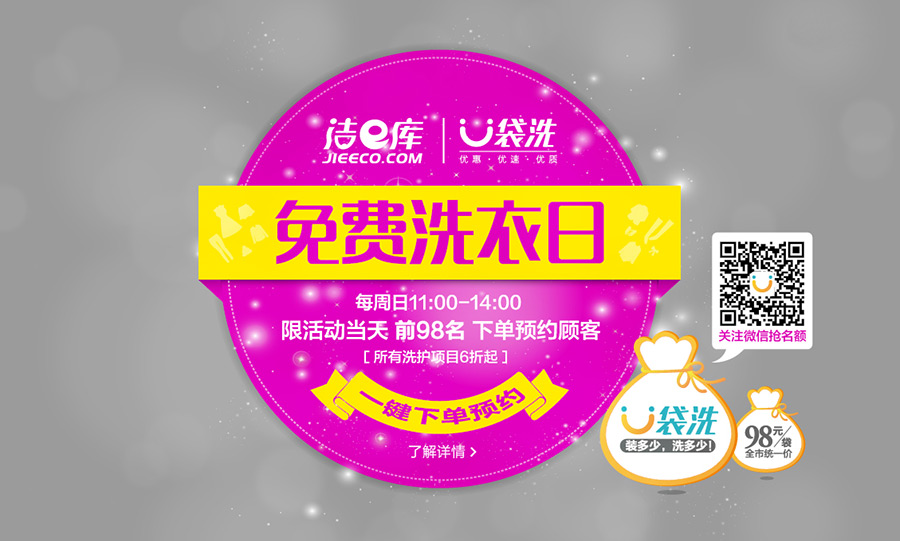 U袋洗網上洗衣自上線以后,98元一袋任意洗且上門收送的服務了街坊的一致叫好,總部決定,“為了讓多羊城百姓的體驗在線洗衣,投入500萬開啟【洗衣日】項目”。
